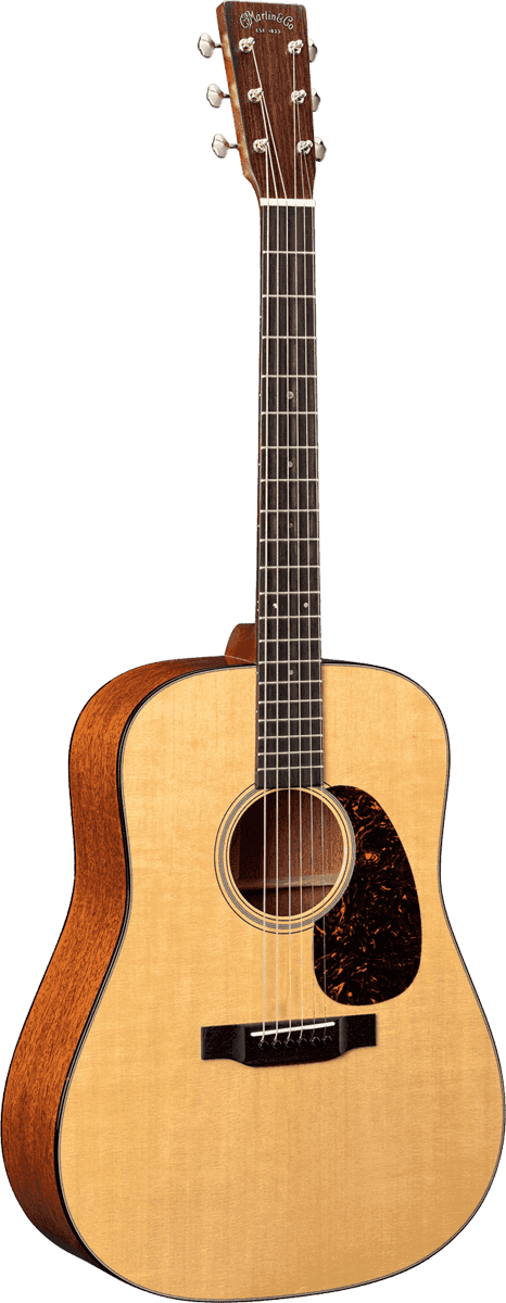 Producteur : MartinDreadnought Epicéa Sitka / AcajouRef : D-18 - Tête : palissandre d'Inde orientale, logo Large Old Style - Mécaniques : ouvertes, finition nickel, avec boutons butterbean - Sillet de tête : os - Largeur de la touche au sillet de tête : 44,4 mm - Manche : bois sélectionné - Finition manche : vernis satiné - Profil du manche : Modified Low Oval avec col Performing Artist - Couvercle talon : tortoise - Touche : ébène noir - Nombre de frettes : 20 - Largeur de la touche à la 12e frette : 54 mm - Repères de touche : Old Style 18 - Type de corps : dreadnought, jonction corps/manche à la 14e frette - Jonction corps/manche : collé, assemblé en queue d'aronde - Filet : tortoise - Diapason : 645 mm - Table : épicéa Sitka massif - Type de barrage de table : standard X forward shifted, échancré - Barrage de table : épicéa Sitka massif 7,94 mm - Finition table : vernis poli vieilli - Filet de table : Boltaron noir/blanc - Rosace : style 18 - Pickguard : Delmar tortoise - Dos : acajou massif authentique - Incrustation filet dos : style 18 - Éclisses : acajou massif - Finition dos & éclisses : vernis poli - Jonction des éclisses : Delmar tortoise - Type de chevalet : style Belly 1930's, sillet posé - Chevalet : ébène noir massif - Espacement des cordes au chevalet : 55,5 mm - Chevilles : noires - Sillet de chevalet : compensé en os, radius 406 mm - Cordes recommandées : Martin SP Lifespan Phosphor Bronze Medium (SP7200) - Autres options : disponible en version gauchère sans surcoût - Étui : type 445